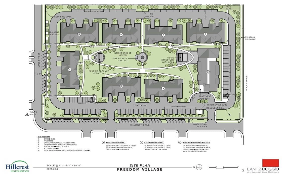 Freedom Village features 28 Garden Homes—arranged in seven attractive quad-plex residences surrounding a central courtyard—as well as 28 private apartments in a modern, secure building with an elevator. Click here to take a virtual tour.